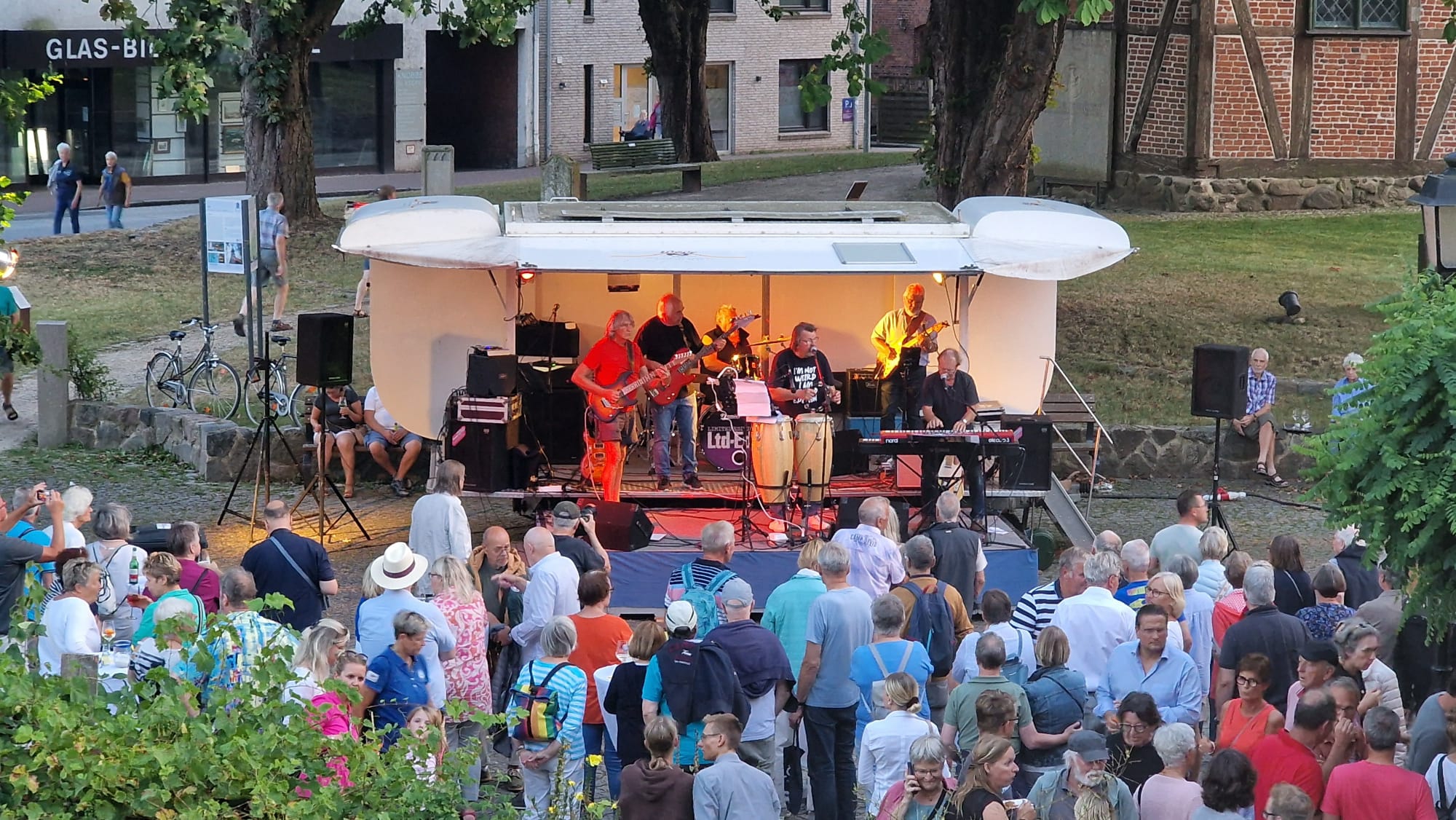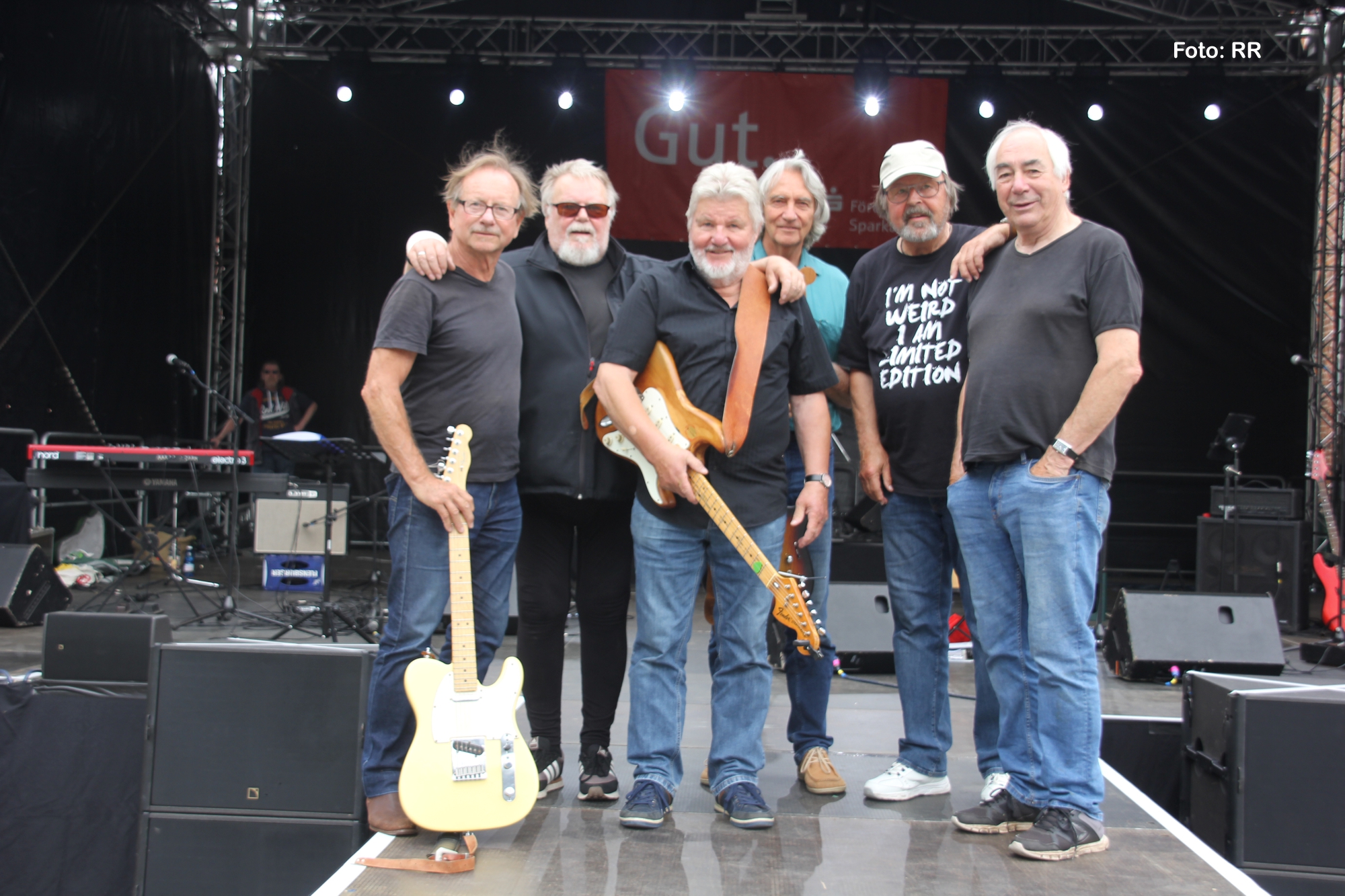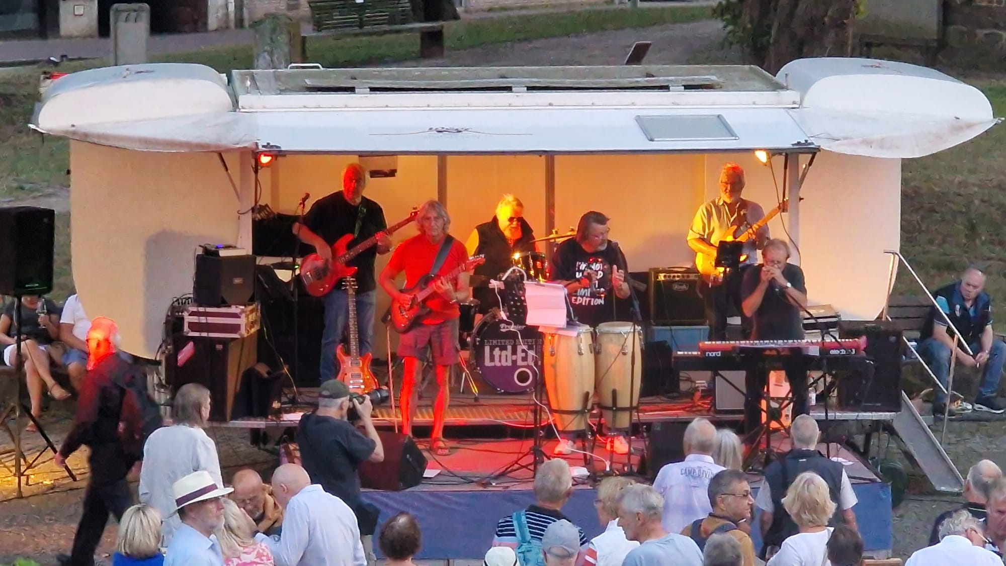 Die regionalen Altrocker aus Plön von Limited-Edition bei der Kulturnacht am 6.9.24 in Plön. Großartiges Wetter, tolle Stimmung, gute Mucke erfreuten die zahlreichen Zuschauer auf der Kulturnacht in Plön. Von links nach rechts: Kai Kröger - Leadgitarre, Wolfhard Walde - Bass und Vocal, Wilfried (Winnie) Brüggen - Gitarre und Vocal, Alfred Solotarev - Drums, Thomas Nieder - Songwriter, Vocal, Tasten und Gitarre, Rolf Timm - Vocal und Percussion.